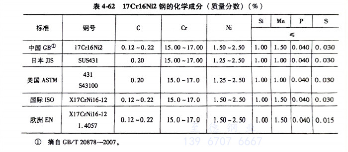 17Cr16Ni2、1.4057、431不銹鋼的化(hua)學(xue)成(cheng)分見表4-62。