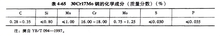 30Cr17Mo 不(bu)銹鋼的化學成(cheng)分(fen)見表4-65。
