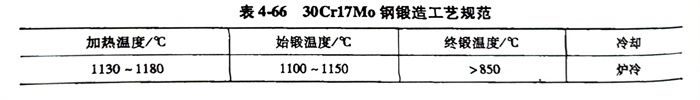 30Cr17Mo 不銹鋼的鍛造工藝規(gui)范見表4-66。