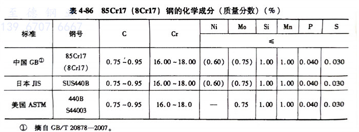 85Cr17(8Cr17)、S44003、SUS440B不銹鋼的化學(xue)成(cheng)分見表4-86。