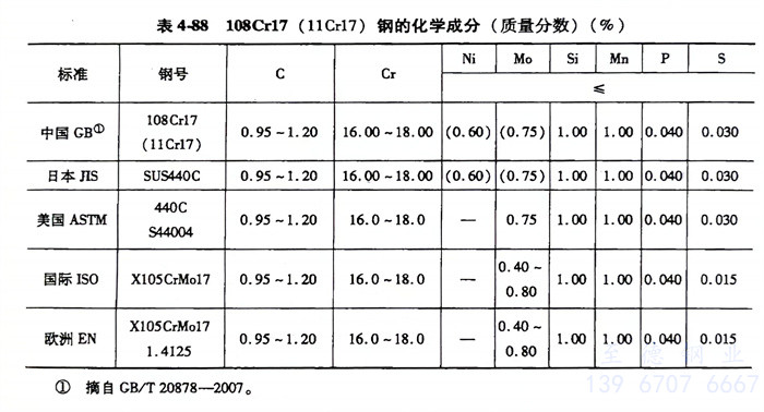 108Cr17(11Cr17)、1.4125、S44004、440C不銹鋼的化學成分見表4-88。