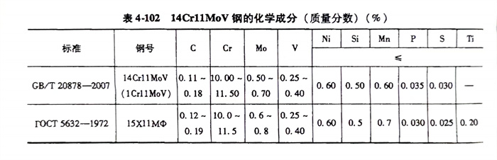 14Cr11MoV(1Cr11MoV)不(bu)銹鋼的化學成分見表4-102。