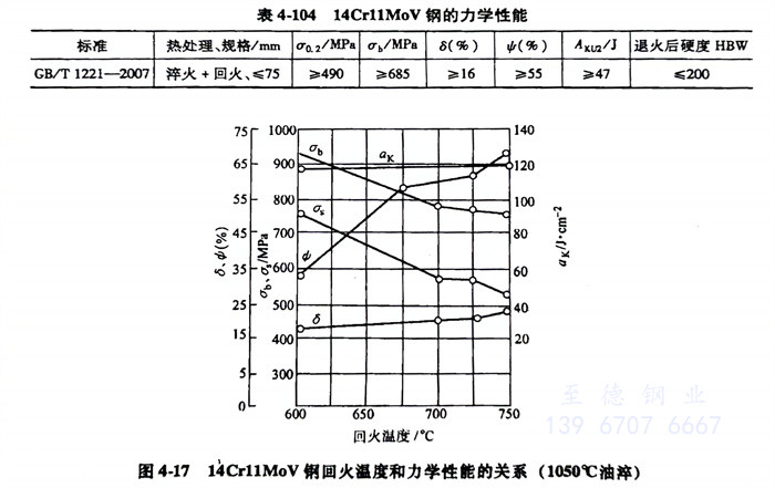 14Cr11MoV(1Cr11MoV)不銹鋼(gang)的力(li)學性(xing)能見(jian)表4-104,14Cr11MoV鋼(gang)回火(huo)溫(wen)度和力(li)學性(xing)能的關系見(jian)圖4-17。