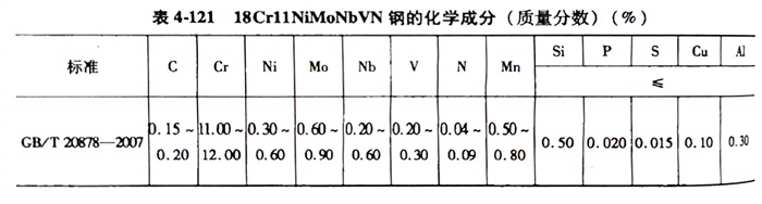 18Cr11NiMoNbVN(2Cr11NiMoNbVN)不銹鋼的化學(xue)成(cheng)分(fen)見表4-121。