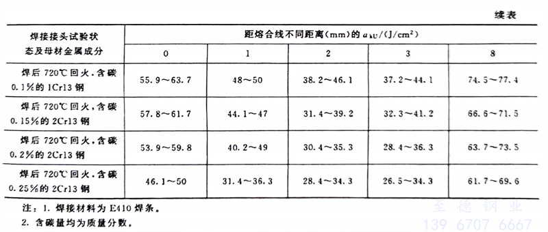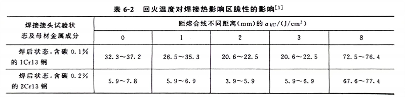 回火溫度一般選在650~750℃,至少保溫1h后空冷。或者按每30mm厚的焊縫保溫1h,隨后空冷。有關焊后熱處理回火溫度對12Cr13(1Cr13)和20Cr13(2Cr13)鋼焊接熱影響區脆性的影響見表6-2。對于剛度小的焊接構件,焊后可冷至室溫后再進行回火熱處理。