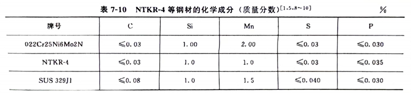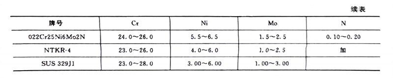 022Cr26Ni5Mo2N、SUS 329J1 雙相(xiang)不(bu)銹鋼(gang)的耐腐蝕疲(pi)勞(lao)性能(neng)遠比(bi)(bi)316L(尿素級)鋼(gang)好,這對在低應力、低頻率(lv)交變載荷條件(jian)下工作的尿素甲(jia)銨(an)泵(beng)泵(beng)體選材有重要的參(can)考價值。為了便(bian)于比(bi)(bi)對,將中(zhong)國的022Cr26Ni6Mo2N,日本的SUS 329J1、NTKR-4等(deng)雙相(xiang)不(bu)銹鋼(gang)化學成分,列入表7-10中(zhong)。