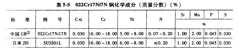 (1)化學成分(fen): 022Cr17Ni7N、301L不銹(xiu)鋼的化學成分(fen)見表5-5。