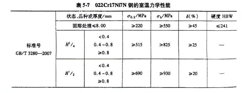 (5)力(li)學性能: 022Cr17Ni7N、301L不銹鋼(gang)的室溫力學(xue)性(xing)能(neng)見表(biao)5-7。