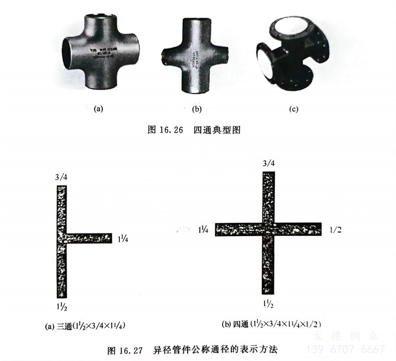 ⑤. 對(dui)(dui)于(yu)異徑(jing)三(san)(san)通(tong),首先(xian)給(gei)(gei)出(chu)最(zui)(zui)(zui)大端(duan)(duan)(duan)(duan)(duan)的(de)(de)(de)(de)公(gong)(gong)(gong)(gong)稱(cheng)(cheng)通(tong)徑(jing),然后(hou)是與最(zui)(zui)(zui)大端(duan)(duan)(duan)(duan)(duan)相(xiang)對(dui)(dui)應的(de)(de)(de)(de)那一端(duan)(duan)(duan)(duan)(duan)的(de)(de)(de)(de)公(gong)(gong)(gong)(gong)稱(cheng)(cheng)通(tong)徑(jing),最(zui)(zui)(zui)后(hou)給(gei)(gei)出(chu)支(zhi)管端(duan)(duan)(duan)(duan)(duan)的(de)(de)(de)(de)公(gong)(gong)(gong)(gong)稱(cheng)(cheng)通(tong)徑(jing);對(dui)(dui)于(yu)異徑(jing)四通(tong),首先(xian)給(gei)(gei)出(chu)最(zui)(zui)(zui)大端(duan)(duan)(duan)(duan)(duan)的(de)(de)(de)(de)公(gong)(gong)(gong)(gong)稱(cheng)(cheng)通(tong)徑(jing),其(qi)次是與最(zui)(zui)(zui)大端(duan)(duan)(duan)(duan)(duan)相(xiang)對(dui)(dui)應的(de)(de)(de)(de)另(ling)一端(duan)(duan)(duan)(duan)(duan)的(de)(de)(de)(de)公(gong)(gong)(gong)(gong)稱(cheng)(cheng)通(tong)徑(jing),第三(san)(san)個(ge)給(gei)(gei)出(chu)的(de)(de)(de)(de)是另(ling)外(wai)兩端(duan)(duan)(duan)(duan)(duan)中較大端(duan)(duan)(duan)(duan)(duan)的(de)(de)(de)(de)公(gong)(gong)(gong)(gong)稱(cheng)(cheng)通(tong)徑(jing),最(zui)(zui)(zui)后(hou)給(gei)(gei)出(chu)剩(sheng)余一端(duan)(duan)(duan)(duan)(duan)的(de)(de)(de)(de)公(gong)(gong)(gong)(gong)稱(cheng)(cheng)通(tong)徑(jing),見圖16.27。