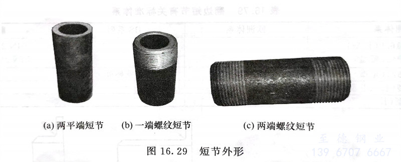 1. 短(duan)(duan)節是長度(du)(du)(du)小于(yu)12in(0.3m)、兩端(duan)或一端(duan)有(you)(you)螺(luo)(luo)紋(wen)(wen)并便于(yu)進行焊(han)接或機械連接的(de)一段管(guan)子。當長度(du)(du)(du)在(zai)12in(0.3m)以上時,則稱為短(duan)(duan)管(guan)。普通(tong)類(lei)型(xing)(xing)的(de)短(duan)(duan)節是全(quan)外(wai)牙型(xing)(xing),螺(luo)(luo)紋(wen)(wen)接口的(de)長度(du)(du)(du)大約(yue)為標準管(guan)螺(luo)(luo)紋(wen)(wen)的(de)2倍,且沒有(you)(you)肩(jian)部。任何長度(du)(du)(du)的(de)帶(dai)肩(jian)螺(luo)(luo)紋(wen)(wen)管(guan)接頭(tou)(tou)的(de)兩個管(guan)螺(luo)(luo)紋(wen)(wen)間有(you)(you)肩(jian)部;短(duan)(duan)管(guan)螺(luo)(luo)紋(wen)(wen)管(guan)接頭(tou)(tou)是比全(quan)外(wai)牙型(xing)(xing)螺(luo)(luo)紋(wen)(wen)管(guan)接頭(tou)(tou)稍(shao)長的(de)帶(dai)肩(jian)螺(luo)(luo)紋(wen)(wen)管(guan)接頭(tou)(tou),且對(dui)于(yu)不同管(guan)徑的(de)管(guan)子的(de)特定長度(du)(du)(du)均(jun)要符合制造(zao)商標準。短(duan)(duan)節外(wai)形見圖16.29。