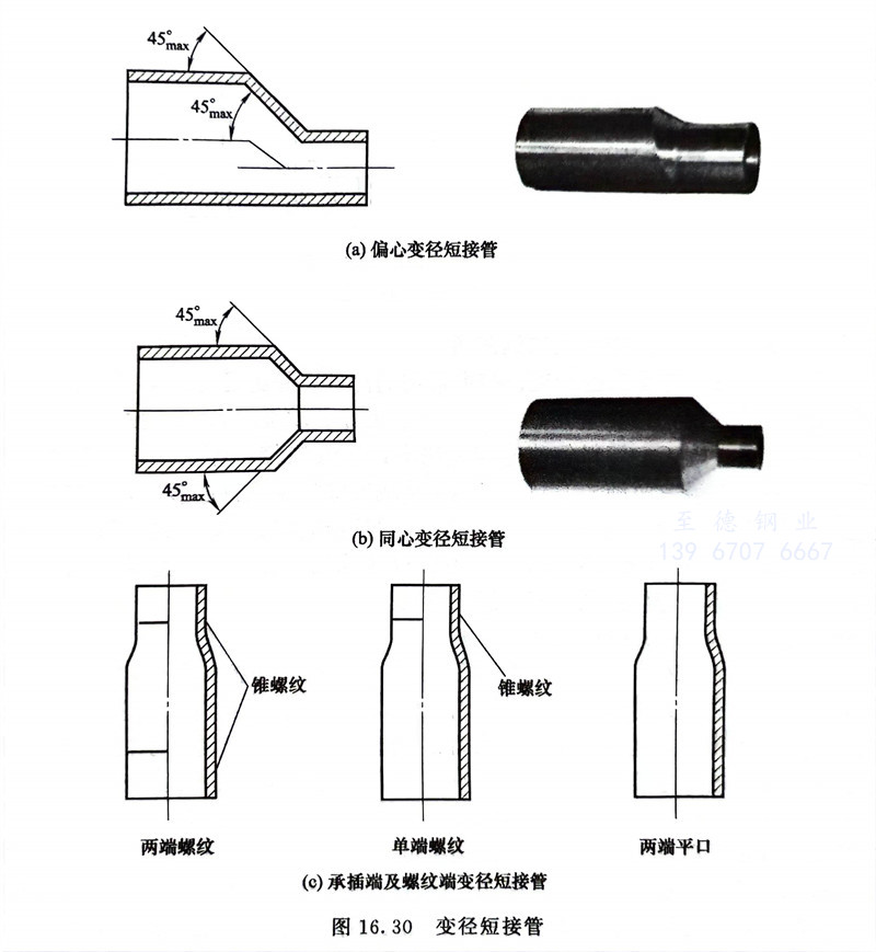 2. 變(bian)(bian)(bian)徑(jing)短接(jie)管(guan)(guan)(guan)(guan)(圖16.30)也(ye)稱(cheng)異形短節、漸縮管(guan)(guan)(guan)(guan),與大(da)(da)小(xiao)頭(異徑(jing)管(guan)(guan)(guan)(guan))相同(tong),用以減(jian)小(xiao)管(guan)(guan)(guan)(guan)線口徑(jing)。變(bian)(bian)(bian)徑(jing)短接(jie)管(guan)(guan)(guan)(guan)可設計(ji)為螺(luo)紋連接(jie)或(huo)者承(cheng)插(cha)焊連接(jie)。變(bian)(bian)(bian)徑(jing)短接(jie)管(guan)(guan)(guan)(guan)和異徑(jing)管(guan)(guan)(guan)(guan)一樣有(you)同(tong)心(xin)(xin)和偏心(xin)(xin)之分(fen)。變(bian)(bian)(bian)徑(jing)短接(jie)管(guan)(guan)(guan)(guan)大(da)(da)端(duan)及小(xiao)端(duan)分(fen)別有(you)平端(duan)、坡口端(duan)、錐管(guan)(guan)(guan)(guan)外螺(luo)紋端(duan)三種,大(da)(da)、小(xiao)端(duan)不同(tong)組合可獲(huo)得九種配合。