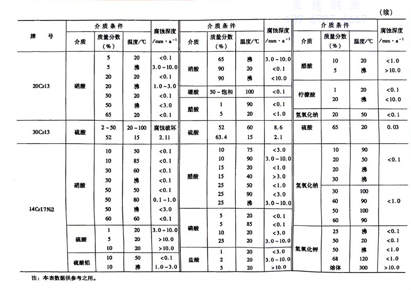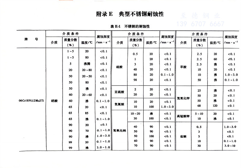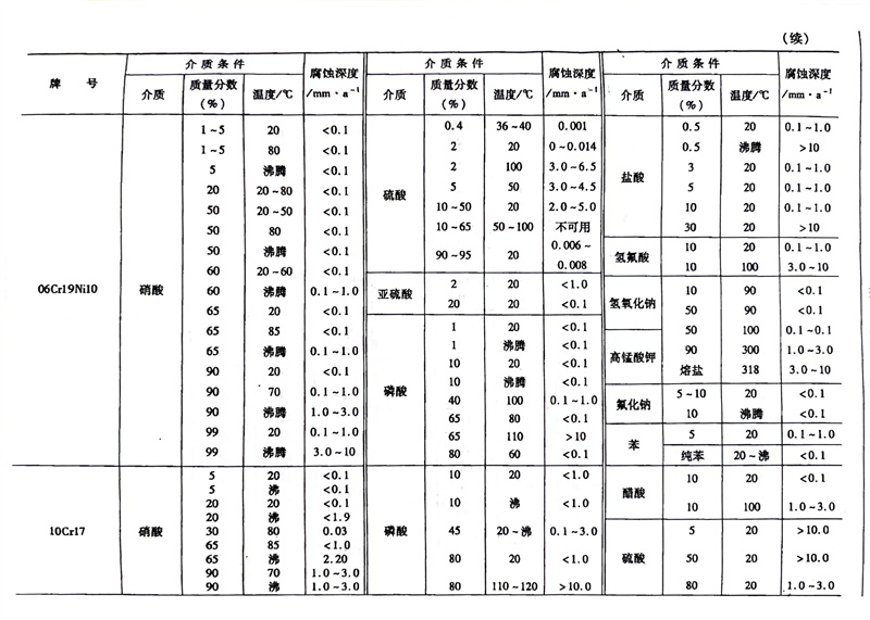 各種(zhong)牌號不銹鋼在不同工況環境下,耐硫酸(suan)、磷酸(suan)、硝(xiao)酸(suan)、鹽酸(suan)、醋酸(suan)、氫氟酸(suan)溶液腐蝕性能參(can)照表