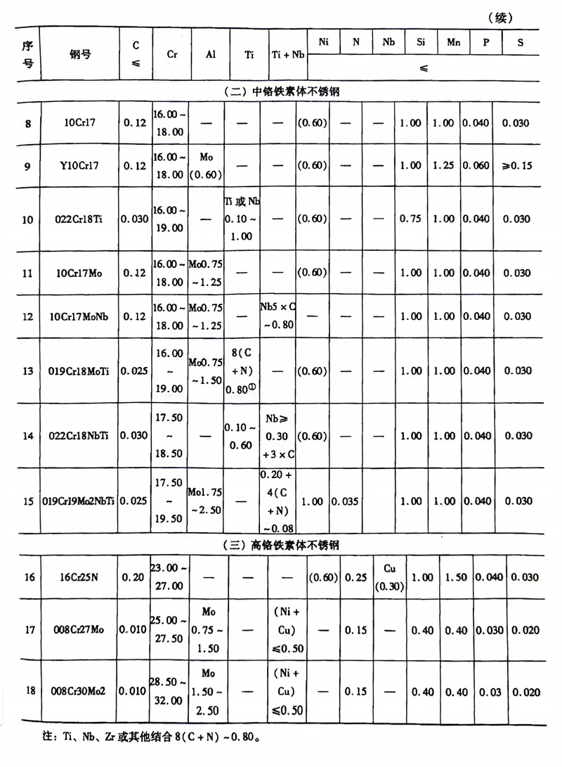 近幾十年來,隨著(zhu)冶煉新(xin)技術的(de)出現,鐵(tie)素(su)體(ti)不(bu)(bu)銹鋼(gang)(gang)的(de)性能有(you)所改善,發展了許(xu)多焊接性好,加工性能優良的(de)新(xin)鋼(gang)(gang)種。在GB/T 1220-1992標準中(zhong)鐵(tie)素(su)體(ti)不(bu)(bu)銹鋼(gang)(gang)僅有(you)8種,而在GB/T 20878-2007標準中(zhong)鐵(tie)素(su)體(ti)不(bu)(bu)銹鋼(gang)(gang)有(you)了18種。下(xia)面浙(zhe)江(jiang)至德鋼(gang)(gang)業(ye)有(you)限公司(si)技術人員分別對其性能和應用進行簡單介(jie)紹。